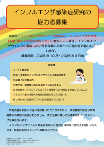 2025-26シーズンにおいて、インフルエンザウイルスに罹患した方に対して感染後の経過に関する研究を長崎市内11医療機関で行っております。